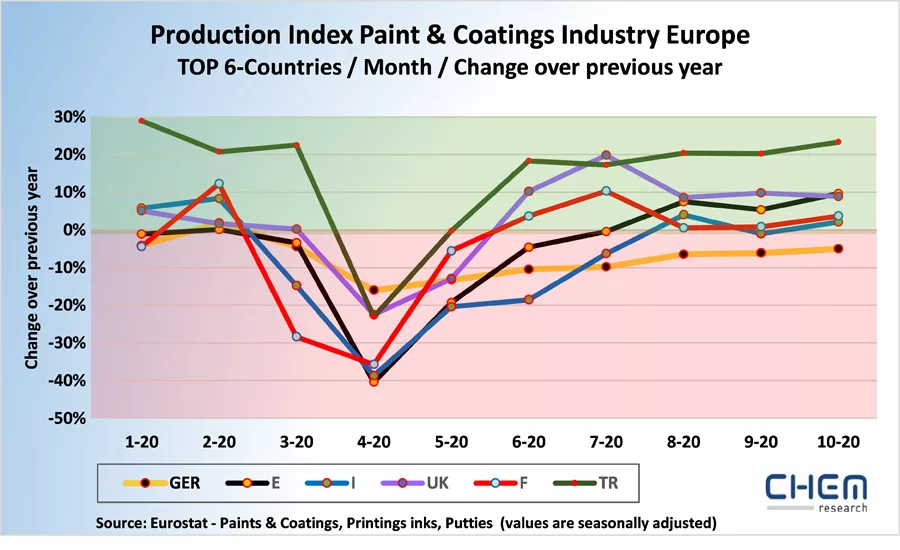 MAINZ, Germany — Market research and consulting firm CHEM Research GmbH released results from its most recent analysis of coatings production in Europe. According to the firm, paint and coatings production in Europe during October 2020 was 1.2% above the previous year’s level. The firm reports that production volume for paints and coatings in Europe continues to increase, but growth is losing momentum. In October 2020, data indicated a production rise of +1.0% over the previous month and a level that is +1.2% higher than in October 2019. Output in Germany for this product group is recovering more slowly than other European countries.