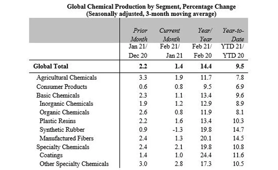 WASHINGTON – Global chemicals production rose 1.4% in February, continuing the global recovery that started last June, according to data collected and tabulated by the American Chemistry Council (ACC). Chemical production grew in the Asia-Pacific region and the Former Soviet Union (FSU), while output was weak elsewhere. Headline global production was up 14.4% year-over-year (Y/Y) on a three-month moving average (3MMA) basis. Output a year ago was off due to the COVID-19 pandemic. Global output stood at 132.0% of its average 2012 levels.