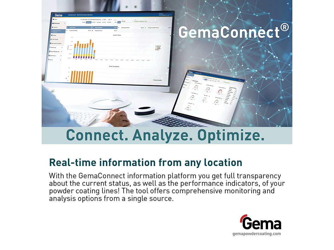 GemaConnect® provides users with full visibility of the current status and key performance indicators (KPIs) of their powder coating equipment, regardless of location or time. A web-based tool continually updating and storing powder coating data for comprehensive monitoring and analysis from a single source, it is designed for all levels of responsibility within a company – business leaders, managers, production staff and maintenance personnel. Each user can access their customized data via the GemaConnect dashboard, allowing them to visualize and analyze their KPIs. Users can put customized indicators and favorites on their screens.