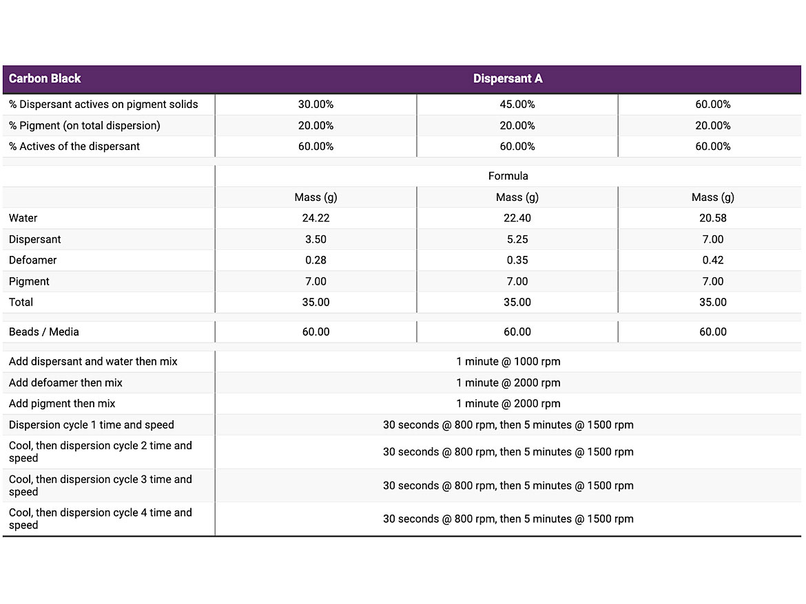 Using the following formulas and dispersant actives on pigment solids for various pigments, these levels were found to work with most pigments and dispersants. For example, a carbon black dispersion in water works best at 30-60% dispersant actives on pigment solids. However, if the carbon black is a large particle size and is a surface treated pigment, lower levels will be necessary. The opposite is true for fine particle sized carbon black pigment. The following suggested levels were found to be a good starting point.