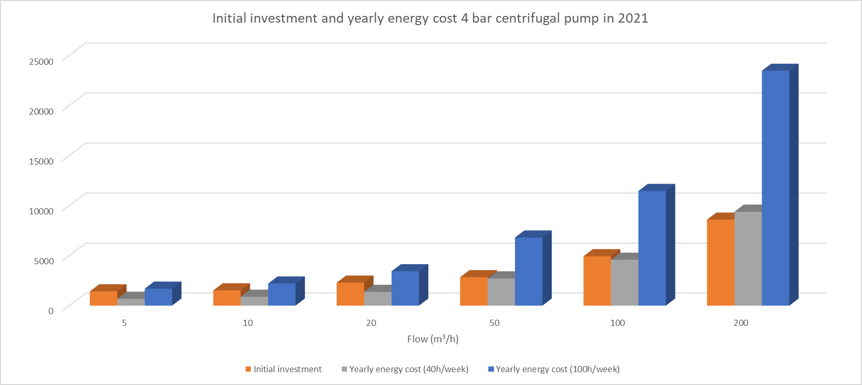 We calculated, based the purchase price of the pump from 2 years ago and with an energy price of €0.2/kWh, how long it took for the pump to consume its own value in energy. For pumps running 40 hours per week, this ranged from 2 to 2.5 years for smaller pumps and to less than 1 year for large pumps. The graph below shows the initial investment and the annual energy consumption (at 40 and at 100 operating hours per week) for a series of pumps that each have to deliver 4 bar head, but at a different flow rate.