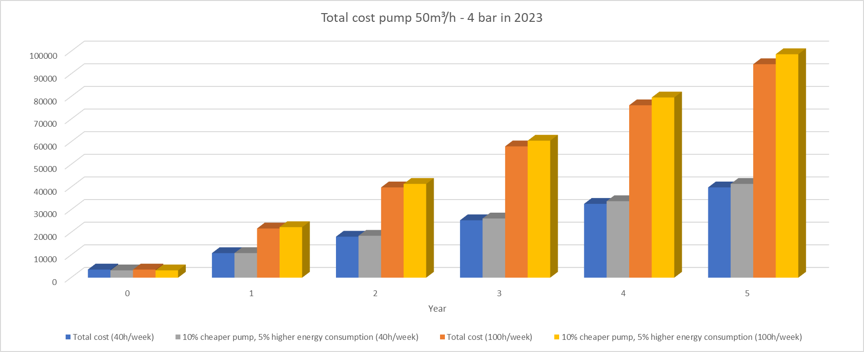 The comparison of these graphs clearly shows that the purchase price of a pump becomes even less important in 2023, but its energy efficiency all the more. A pump that is 10% cheaper to purchase, but consumes 5% more electricity, costs just as much as the more expensive pump after a year of use at only 40 hours per week. For all subsequent years, you pay the difference in purchase price to your energy supplier every year. If the pump is used 100 hours per week, the difference is much more pronounced.