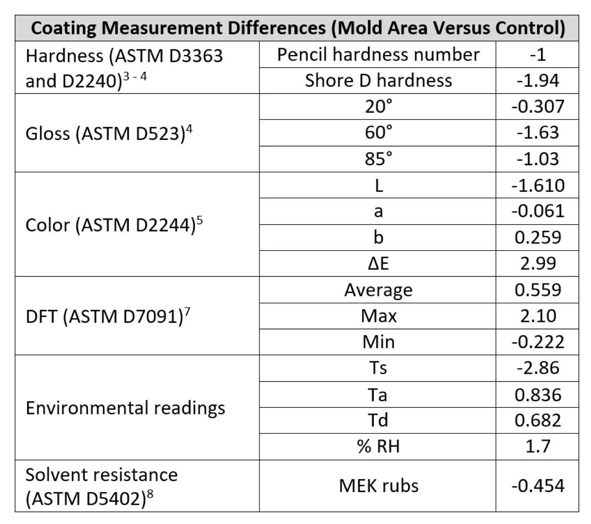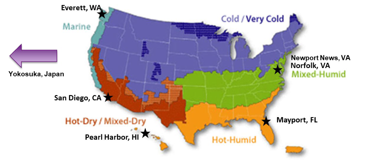 In 2021, ship inspections were performed to determine the extent of the mold issue across the Navy surface fleet. Ships were inspected at seven locations across the continental United States (CONUS) and Japan, each with a unique local climate (Figure 1). The ship inspections consisted of mold swabs, sampling, and physical coating assessments, including measuring coating dry film thickness (DFT), color, gloss, hardness, and solvent resistance. During the inspections, environmental conditions were also measured. These measurements were taken in areas where mold was visually present and compared to control areas where mold was not seen. A summary of the coating assessment is given in Table 2. In general, there was little difference in coating condition in areas affected by mold, with the change in color being the most obvious. It was found that mold grew in locations with lower surface temperatures and higher relative humidity (RH) within a given ship compartment.