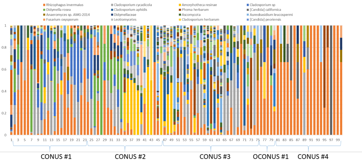 DNA extraction was accomplished using Qiagen DNeasy UltraClean extraction kits following the manufacturer’s protocol. From the ship survey, 123 separate sample locations were processed for their triplicate combined DNA. The concentration and quality of DNA was measured using a NanoDrop spectrophotometer. Samples that had low DNA yield were set aside, leaving 100 samples for downstream processing. These 100 samples of DNA were then sent to Microbial Insights in Knoxville, Tennessee for Next Generation Sequencing. After bioinformatics processing for each sample run, the results were tabulated listing the identified fungal taxa and their associated sequencing hits, i.e., the number of specific gene copies identified for fungal taxa. The raw sequencing hits were converted into relative abundance numbers (normalized to 1.0) for the fungal community of each sample. Figure 2 shows the relative abundance and biodiversity across all samples. The most abundant taxa are included in the legend at the top of the figure.