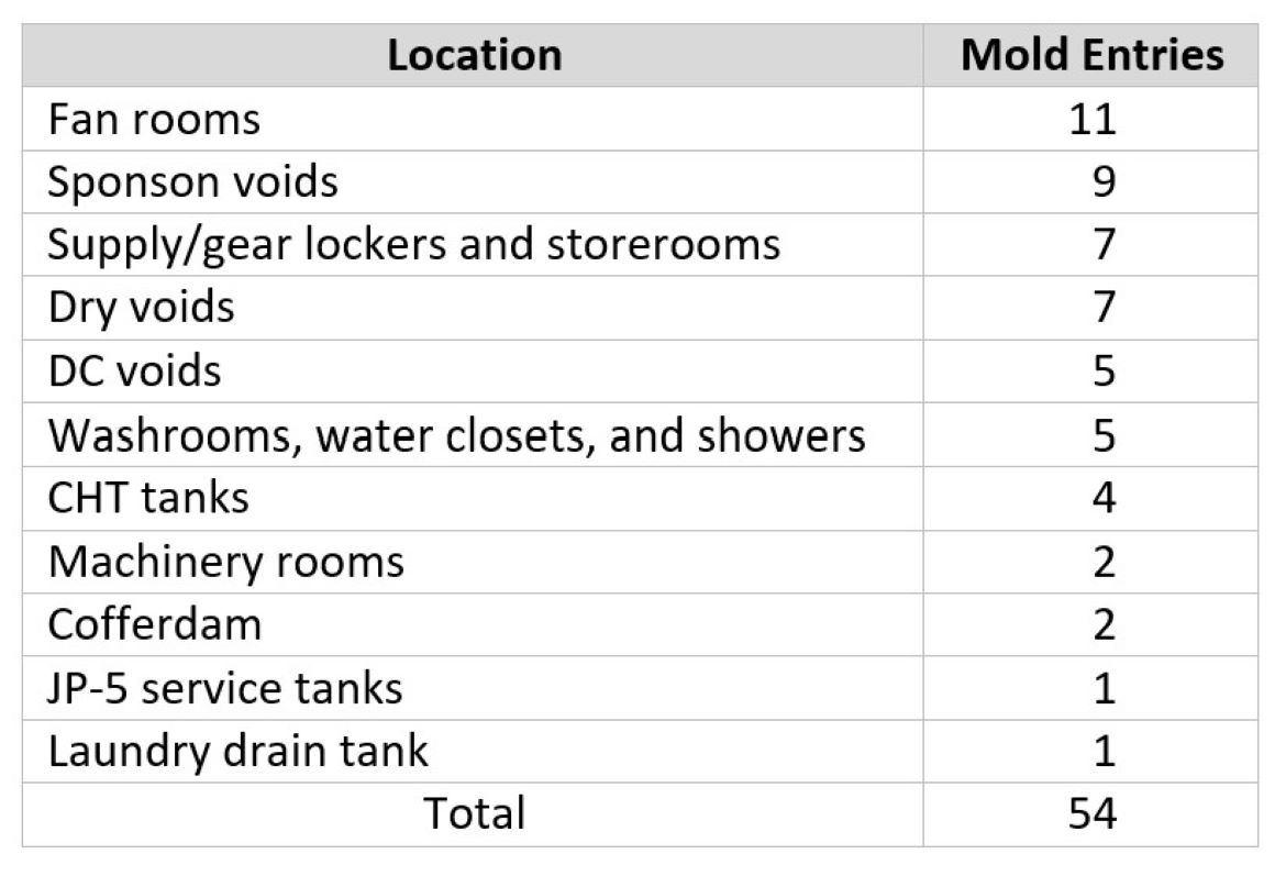 Prior to ship visits, inspection data from maintenance report cards (MRC) was reviewed to identify high-risk compartments for mold growth (Table 1). Review of inspection data collected between 2011 to 2021 described 54 cases in which the certified Shipboard Corrosion Assessment Technician inspecting a given area noted mold or mildew build-up in that area. Mold and mildew are not typically a metric measured in these inspections, suggesting the amount of mold in these areas may have been too excessive to ignore.