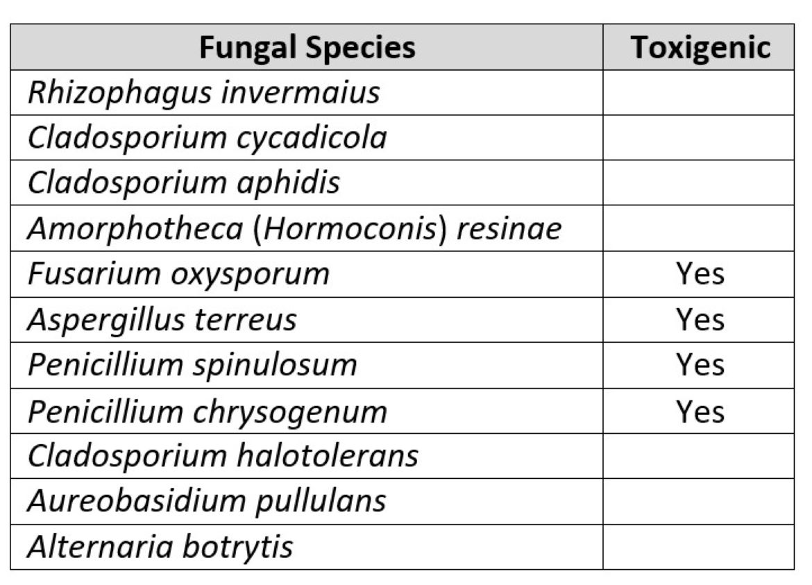 Samples with the most fungal diversity and richness were selected from each location and sent to an industry partner for independent analysis and verification. The four most abundant fungal species identified were: