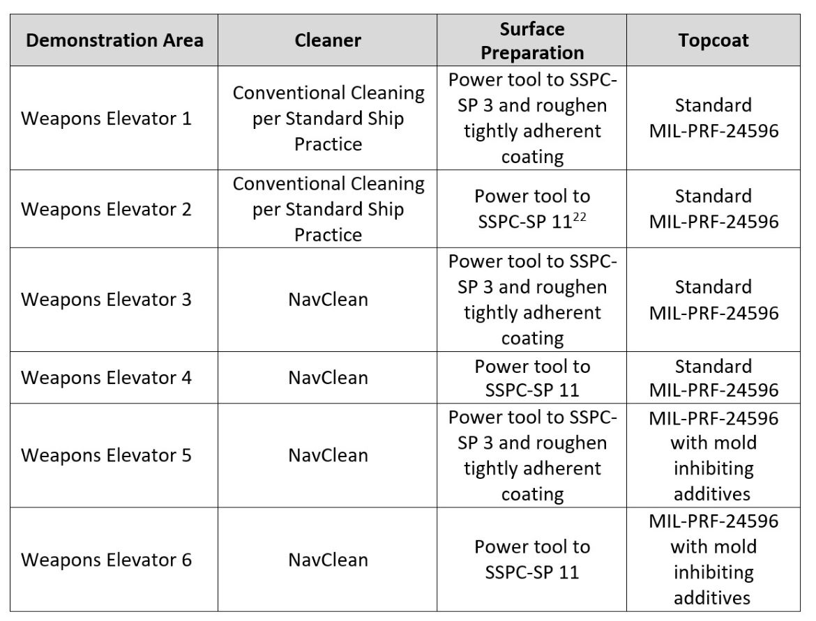 NavClean is a recently developed cleaner created by NAVAIR to combat mold on aircraft. Testing has shown NavClean to be highly effective at killing mold spores and hyphae.16 Alternatively, standard cleaners used in the Navy only remove surface mold while leaving the hyphae to regrow soon after cleaning. The mold-inhibiting MIL-PRF-24596 coating and NavClean are being tested during both ship demonstrations. In one of the ship demonstrations, both products were tested on three magazine spaces. On the other ship, the demonstration took place in six elevator spaces. A summary of the cleaning, surface preparation, and application processes in each demonstration are given in Tables 4 and 5.