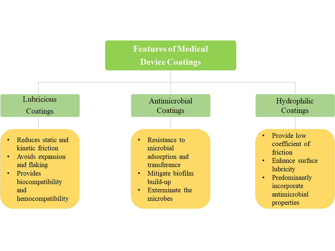 Different coating materials have been used to increase the biocompatibility of medical equipment. This can be attributed to the fact that each type of coating provides specific attributes to the medical device (Figure 2). Some of the common types of coatings (based on different applications) include lubricant coatings, antimicrobial coatings, and water-repellent polymer-based coatings.