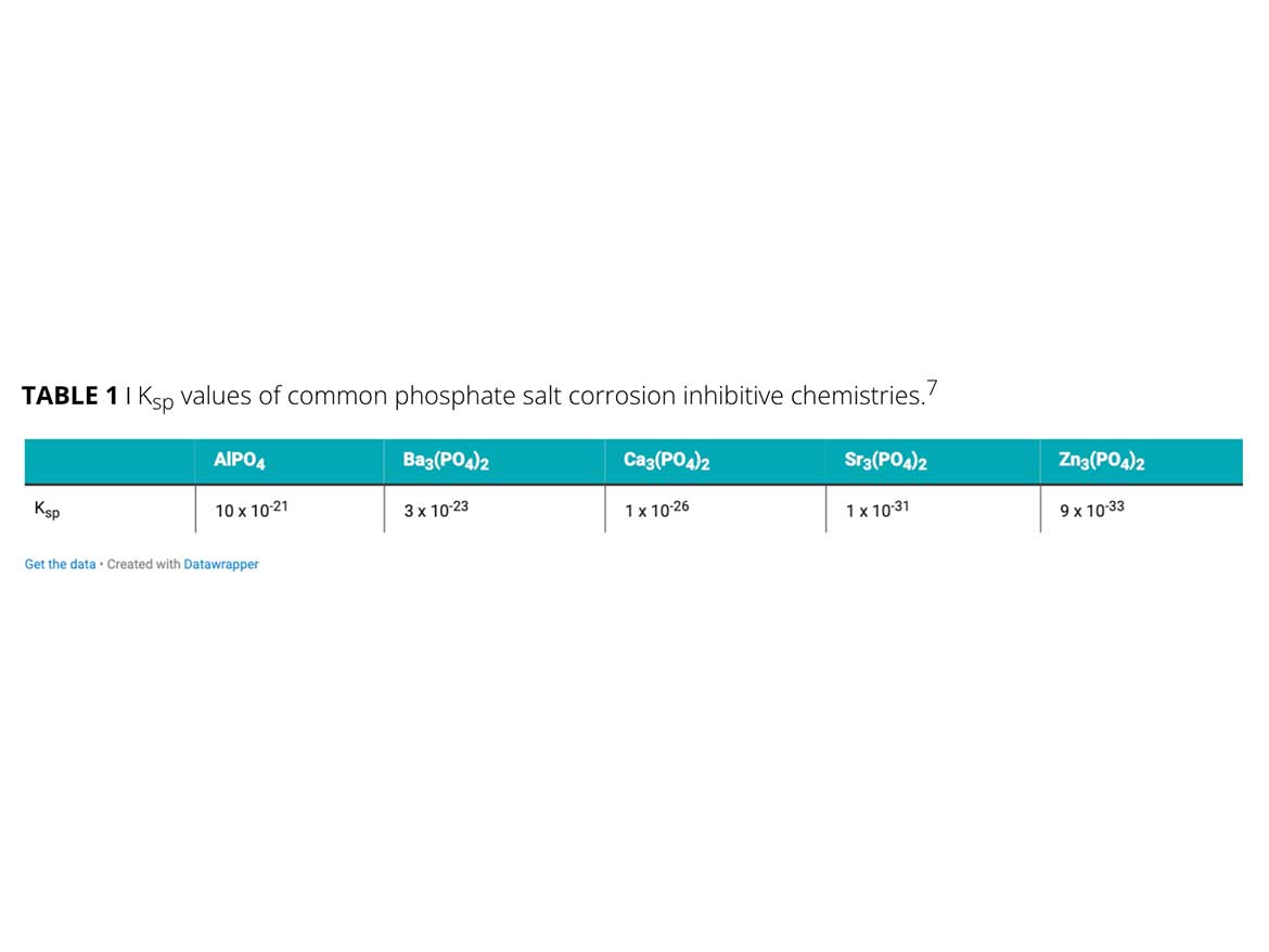 A key property that determines performance level is the solubility of the metallic salt. Inorganic inhibitors are insoluble in water. Their very low Ksp values demonstrate the maximum number of ions that will be solubilized in a water solution at a given time. Table 1 depicts the Ksp values for various phosphate salts. Zinc phosphate is known to provide excellent corrosion protection, which correlates to having the lowest solubility. The passivation mechanism will be available for longer-term protection because of the slow solubility.