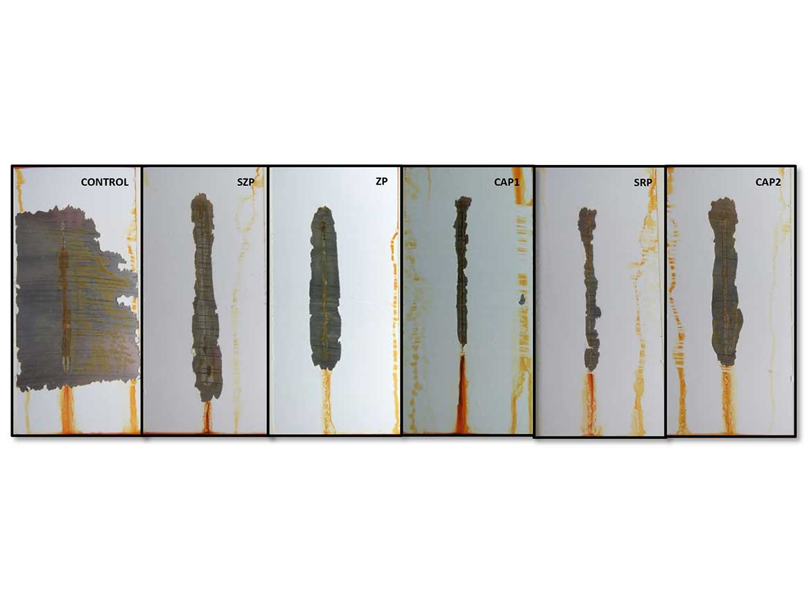 Several water-based resin technologies were selected to demonstrate the performance of heavy-metal-free corrosion inhibitors versus their zinc-containing counterparts. Gloss, cross hatch adhesion, field blistering, scribe creep, and field corrosion were assessed during the evaluation. Analysis of these products is predominantly focused on the scribe creep measurements at failure in salt fog as specified by ASTM B-117. At the end of the salt spray exposure, adhesion at the scribe was measured according to ASTM D-1654, Procedure A, Method 2. The panel is scraped perpendicular to the scribe mark with a metal spatula, and a measurement of total scribe width, divided in half, is reported. Measurements of the scraped scribe were taken at five positions along the scribe and averaged over two panels. For this study, scribe creep values are measured in millimeters and expressed as a percentage improvement versus the control.