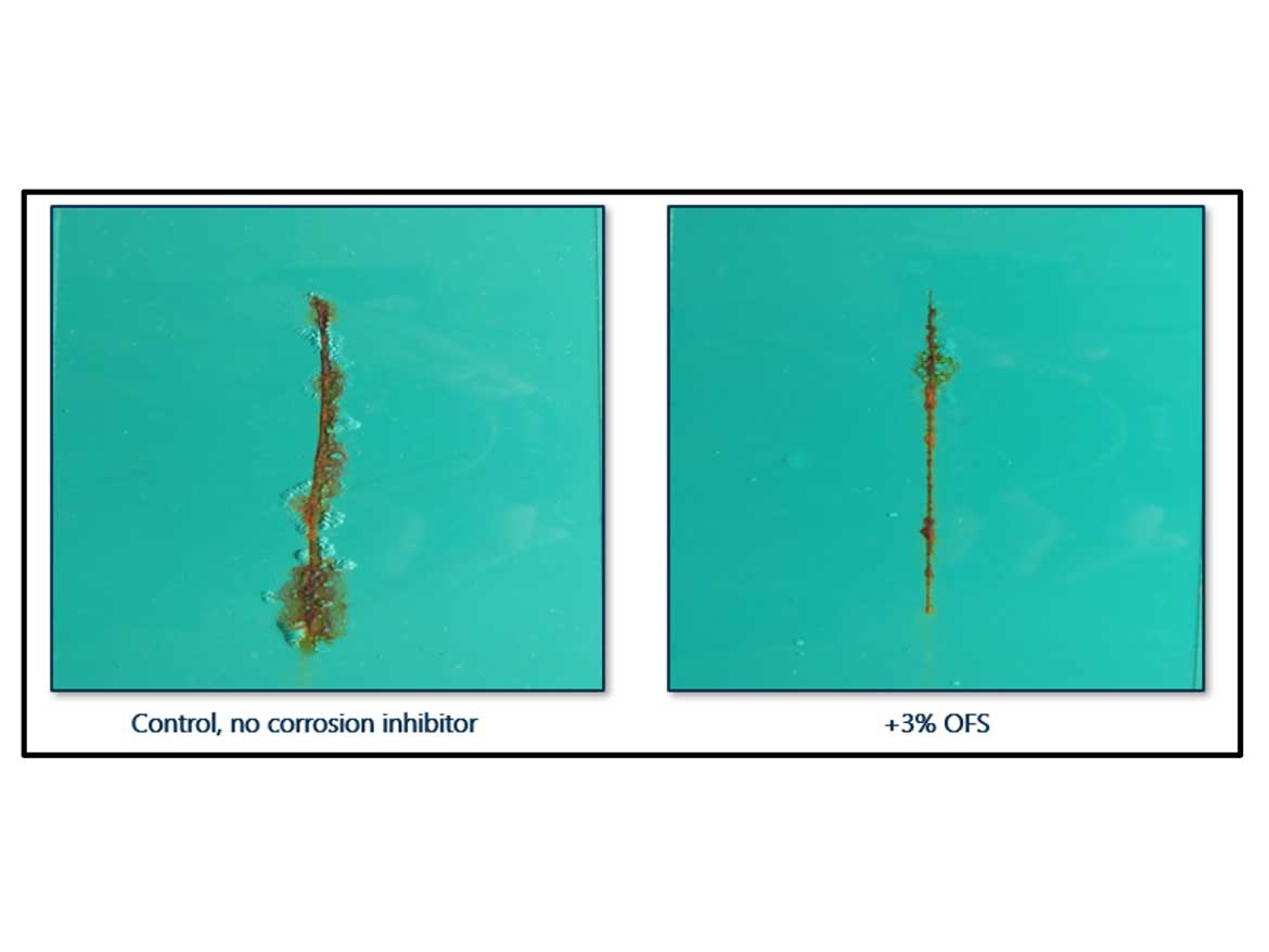 Organic chemistries can also provide corrosion benefits in applications where inorganic pigments are not tolerated. These situations are common when developing a high-gloss product, or when the application requires a low dry-film thickness. In the case of this water-reducible alkyd system, an organofunctional silane (OFS) addition provides a blistering reduction at the scribe at 96 hours of salt spray testing. The adhesive benefit of the silane reduces delamination at the scribe, as seen in Figure 4. When the loading level is optimized, the functional groups of the molecule can also act as a wetting agent and offer improved gloss levels (Table 4).