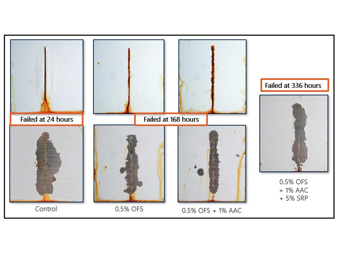 The addition of an organofunctional silane has also demonstrated benefits in a water-based acrylic-epoxy hybrid system. The scribe creep width was greatly reduced with just 0.5% addition, based on total formula weight. Further enhancement of the corrosion performance was achieved by adding a complimentary acid-amine complex (AAC) and an inorganic powder, strontium phosphosilicate (SRP). The combination of these three products provides superior performance versus the blank control, all while providing solutions that are HMF. The corrosion-inhibitor combination achieved 336 hours of salt spray exposure, while the blank failed at just 24 hours (Figure 5). The addition of the SRP doubled the salt spray performance beyond the organic products on their own. Combining multiple products allows the formulator to fine tune the performance of the coating based on the performance requirements for each application.