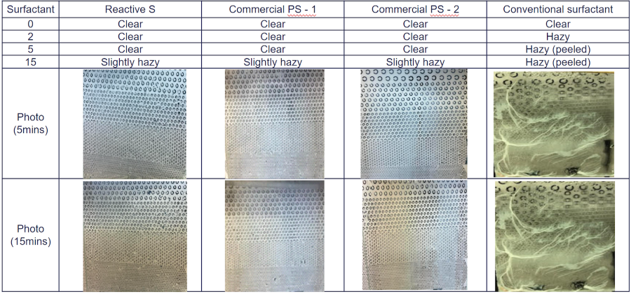 An early blistering test was performed according to the procedure described below. Paints were drawn down on aluminum panels, and let to dry overnight in a controlled-humidity room. Then the panels were placed in the QCT condensation chamber. The panel appearance of the exposed areas were checked at various time intervals of 1, 4, 8, and 24 hours. At the end of the test cycle (24 hours), the final blisters were checked, as illustrated on the photos shown in Figure 8. Both conventional surfactant-based paints showed soft film with medium dense blisters, while the paint based on Reactive S polymerizable surfactant showed no signs of blisters at all.