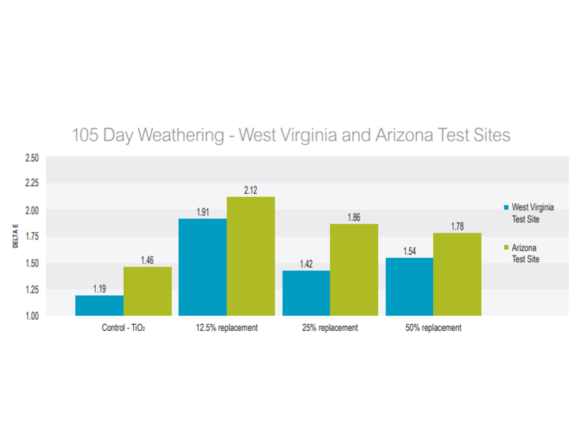 Figure 4 reveals minimal color difference between the test coating without EverWhite pigment and the test coatings with the EverWhite pigment substitutions.