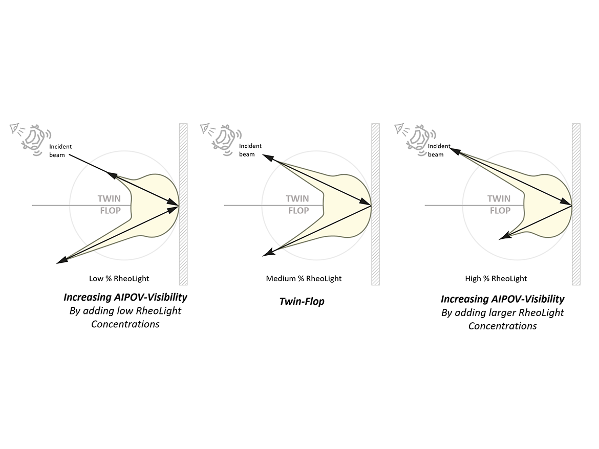 This twin-flop effect is a unique property, intrinsic to crystal glass pigments, which always adds increased point-of-view visibility to colors. In each application, crystal glass pigments always reflect a return signal component back along the direction of incoming light or laser. By optimizing the addition of crystal glass pigments, the best of both worlds is combined in retaining the desired ‘flop effect’ (caused by the orientation of effect pigments in an aligned manner), and adding a return signal along the direction of the incoming light or laser source. This results in the twin-flop effect, while enhancing the point-of-view visibility for every coating, as shown in Figure 1.