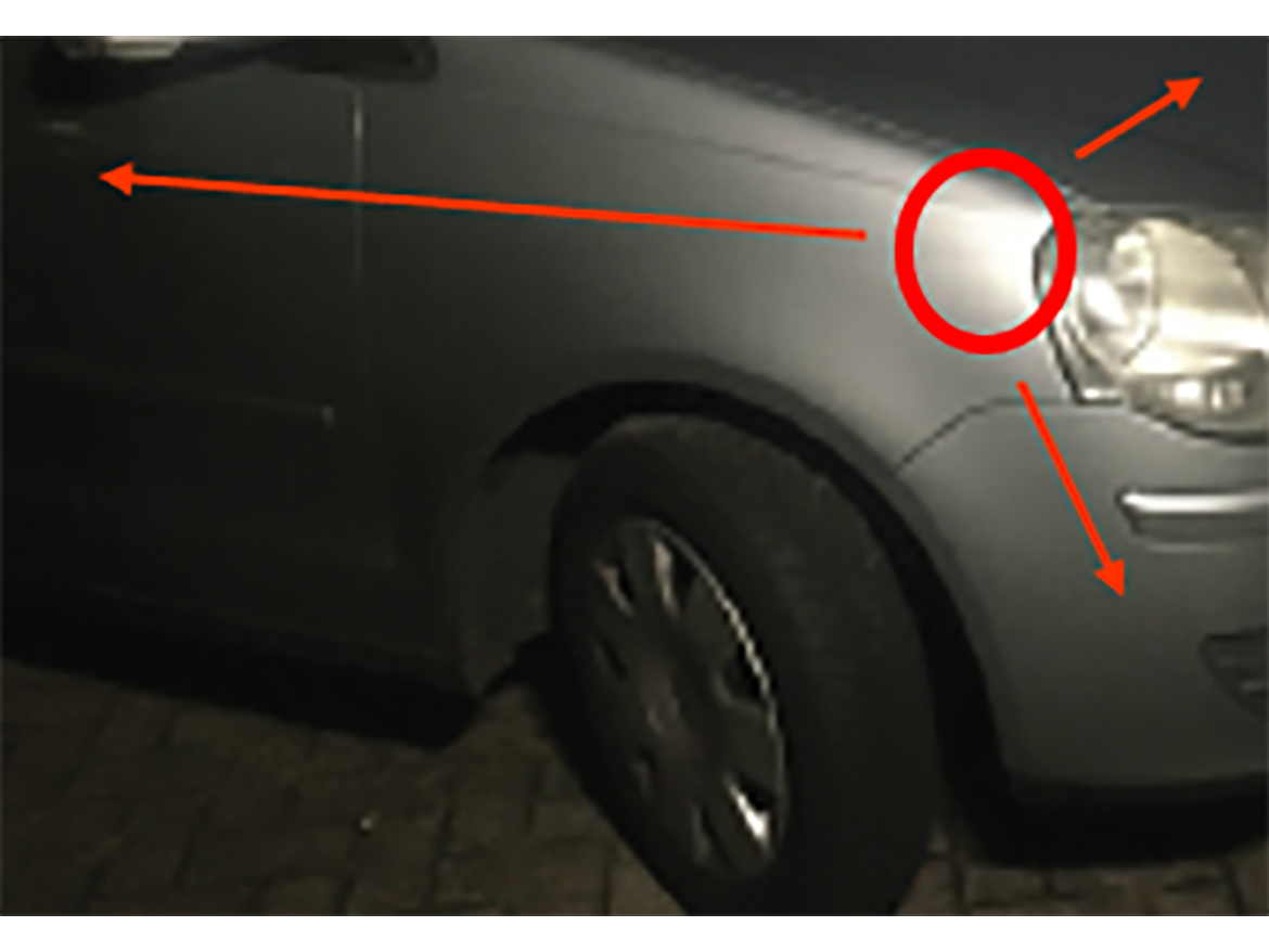 The relatively large ratio of the larger curved surface area with regard to the smaller perpendicular area calls for a new way of interpreting full-object visibility. We think we see the car completely, but our mind translates and interprets reality to what we think we see, as the visibility of areas with increasing angle recedes quickly. We think we see the whole car, but only a small part is actually very visible and a much larger part decreases in visibility quickly. This effect also influences the object sharpness or contrast of the edges of the car. At these higher angles the car visibility morphs into the black surroundings (see Figure 5), thereby also decreasing the propensity for object recognition and determination.4