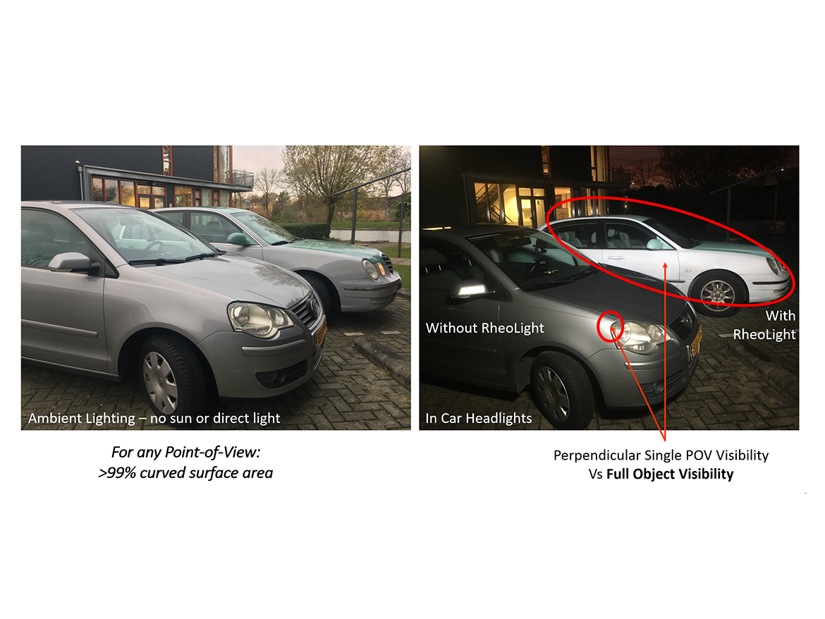 Even though the application of retro-reflective pigments as a potential solution has been researched since the first half of the last century, and numerous patents have been filed in this field, RheoLight™ is the world's first 3D, form-free, industrially applicable and commercially viable, patent-portfolio-protected crystal glass-pigment (CGP) technology. This technology provides perfectly round crystal glass-microsphere dispersions that solve the technical challenges for incorporation in high-end color coating systems, providing increased visibility and detectability, while still maintaining the high-end thin-layer finish required by the automotive and wider-mobility industry.