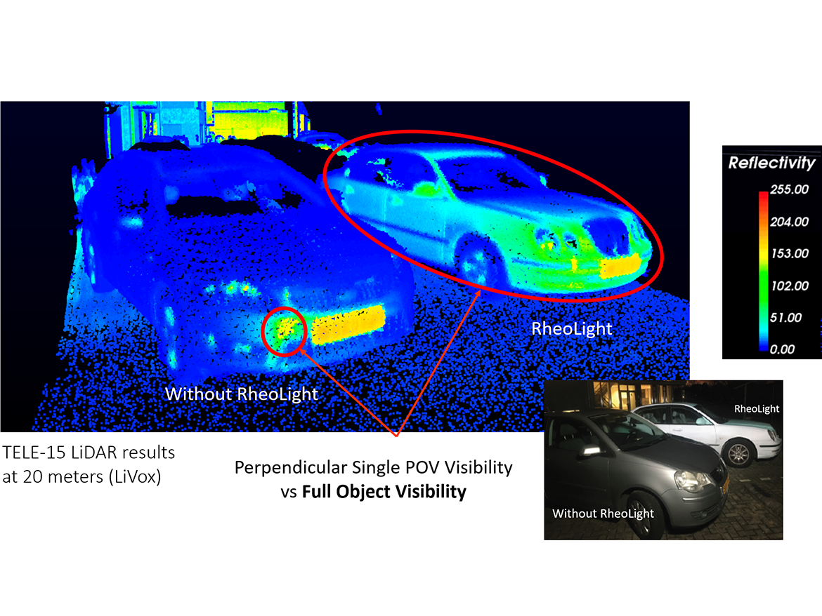 Applied in a color coating in low concentrations (i.e. below 5 w%), crystal glass pigments give a more-subtle twin-flop effect, a subtle new play with light for optical appeal and design (see the left picture in Figure 2). In higher concentrations (i.e. up to 25 w%), the addition of crystal glass pigments significantly increases the visibility of vehicles in any color, but trades off the ‘flop effect’ (see the right picture in Figure 2). In low concentrations, while retaining the flop effect, RheoLight can, for the first time, make metallic and dark-colored objects more visible to LiDAR systems where such colors were previously not or hardly detectable. Where mobility color trends are still dominated by dark colors and metallics, manufacturers now have the opportunity to offer these CGP-enhanced colors that are more visible for LiDAR systems.