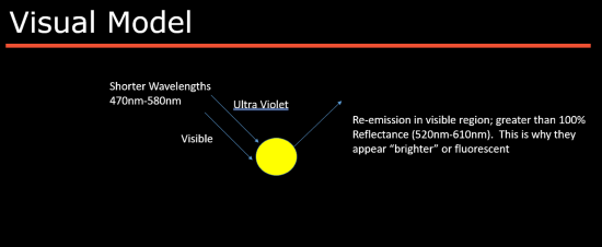 Fluorescent pigments are not “pigments” in the classical sense, but rather they are fluorescent dyes solubilized in a given polymer matrix. This dyed polymer fluorescent pigment is then provided in a format, such as dry powder, suitable for a given end application.
