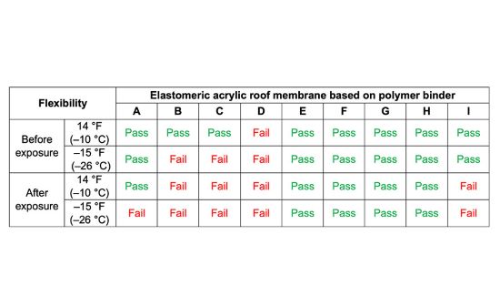 The results in Table 4 show elasticity changes in some samples, particularly those based on binders A, B, C, D, and I. Sample A exhibited failure after exposure, but only in the elasticity test at -26 °C. Before and after exposure, it passed the bend test at -10 °C. The binder used for sample A had a Tg of 0 °C. By comparison, sample D failed the test even before exposure, unable to withstand the bend test at both -10 °C and -26 °C, despite having a slightly lower Tg (-5 °C). This suggests that relying solely on Tg when selecting polymer dispersions for applications like elastomeric roof coatings is not ideal. Many theoretical Tg calculations or measurements do not accurately interpret the binder’s elasticity, especially at temperature extremes. While not all climates require binders with a Tg of -30 °C to -40 °C, which can achieve excellent elasticity even after exposure, it is crucial to carefully test binders for specific applications where flexibility is critical.