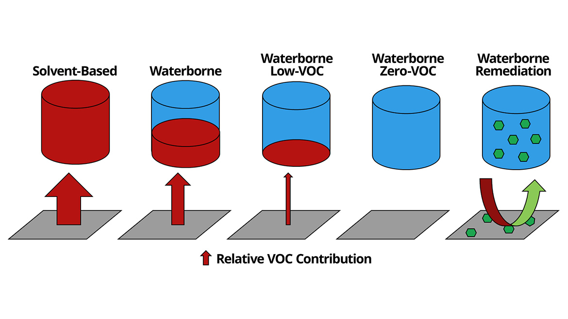 Driven by environmental, health and safety concerns, coating technologies have undergone a dramatic shift in the past few decades. Most of this movement has been driven by the reduction of VOCs and other hazardous materials in coatings formulations (Figure 1). The continuous development and improvement of waterborne technologies has enabled many solvent-based systems to be replaced with waterborne chemistries that contain significantly lower VOC content than their solvent-based counterparts. VOC levels have been pushed even lower by the development of low-VOC and zero-VOC water-based formulations. A continuation of this trend emerging in the global coatings industry has been focused on the development of functional coatings that not only limit emissions of VOCs into the environment but extract and remove VOCs that have originated from other sources.1,2 A functional coating with VOC-remediation capability could improve indoor air quality and provide a means to scavenge VOC emissions from sources that have proven to be more challenging to address.