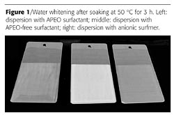 A possible way to overcome these problems is to covalently incorporate the surfactants in the polymer chain so they become ‘anchored' to the particles. This requires surfactants that possess a ‘reactive' group that is active through a free radical mechanism. A simple maleate surface-active monomer, or ‘surfmer,' has been described as surfactant in the emulsion copolymerization of styrene and of styrene/butyl acrylate/acrylic acid.5 This surfmer has been investigated in the preparation of self-crosslinking acrylic dispersions.6 The use of this surfmer resulted in improved coating properties, such as better gloss retention, water-barrier properties and blocking resistance. At present, both in-house or commercially made surfmers are available. An essential feature for a surfmer is a double bond with a relatively low reactivity. If the copolymerization with (meth)acrylic or styrene monomers is too fast, the surfmer will become buried within the polymer particle and hence lose its stabilizing function. The use of surfmers is especially important in the replacement of alkyl phenol-based surfactants (APEO). It is well known that the currently available alternatives, mainly based on fatty alcohol hydrophobes, are less compatible with the polymer matrix than the APEO-types and will therefore be more prone to migration. This results in a significant reduction in water resistance as illustrated in Figure 1 where polymer dispersions with identical monomer compositions but prepared with different surfactants are shown after water-soaking.