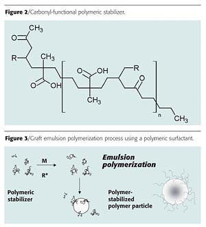 Another route to circumvent the use of low-molecular-weight surfactants is the use of polymeric stabilizers in the emulsion polymerization process. Polymeric stabilizers have been used for a long time.7 Typically, the polymers used are styrene/acrylic acid resins prepared by solution or bulk polymerization in the presence of a chain transfer agent, having an acid value of 140 - 300 mg KOH/g and a molecular weight of 1000 - 5000. The problem associated with the use of these high-acid-value polymeric stabilizers is the intrinsic water sensitivity of coatings made from these dispersions. Nuplex Resins has developed a polymerization process in which we can make polymeric stabilizers with an acid number that is considerably lower than the ones commonly used.8 Furthermore, carbonyl groups are introduced in the polymer so the stabilizer can co-react with a hydrazide crosslinker (Figure 2).