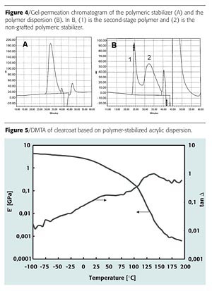 A simple clearcoat formulation was made with the polymer-stabilized acrylic dispersion. The formulation is given in Table 4.The mechanical properties of the clearcoat were investigated by means of dynamical mechanical thermal analysis (DMTA). Figure 5 shows a DMTA plot of a film dried at ambient temperature for seven days.