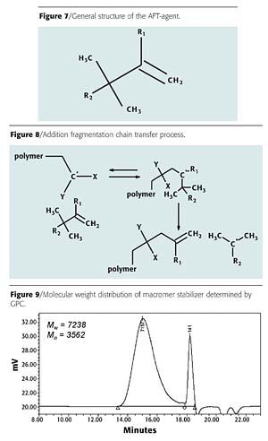 A proprietary polymerization process has been developed by Nuplex Resins to make macromer stabilizers using an addition fragmentation transfer (AFT) agent that does not involve the use of heavy metals. The general structure of the AFT agent used is given in Figure 7. The AFT agent can react with a propagating polymer chain as described in Figure 8.