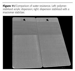 Even though the polymer-stabilized dispersions contain a relatively large amount of hydrophilic stabilizing polymer, the carbonyl-hydrazide crosslinking ensures that the water sensitivity is minimal. This is even more clearly illustrated in Figure 6 where two panels are shown immediately after a water immersion test performed at 50 deg_C after 16 hours of film drying at ambient temperature.