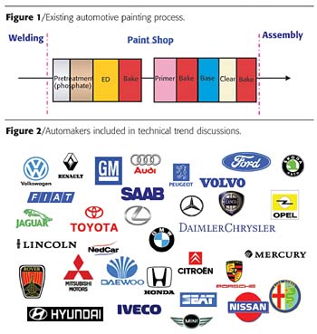 Discussions were held with the major automobile producers (Figure 2) to collect their technical painting directions. These automakers are present in all the major regions of the world. In summary, all producers are seeking a shorter, more-efficient painting process with less investment and shorter process times. Of course, this desire is coupled with a flexible painting system that allows for quick model changes and new, aesthetically pleasing colors to differentiate models.