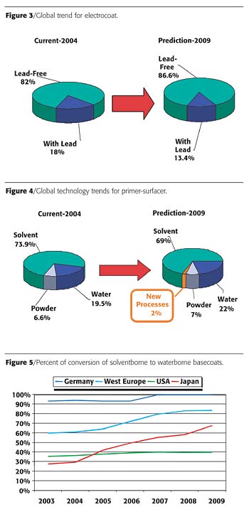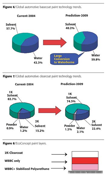 A continued conversion from solventborne basecoats to waterborne is predicted to occur within the next five years, as shown in Figure 5. This conversion is accelerated in Europe as automakers strive to meet the European Union VOC directives targeted in 2007.However, the conversion to waterborne basecoats is also projected to occur in Japan and Korea as the automakers strive to achieve an environmentally friendly coating system with excellent aesthetics.