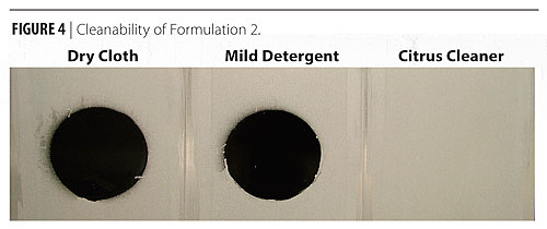 Formulations 4 and 5 have a matte finish but have poor graffiti resistance. The cleanability of Formulation 5 is shown in Figure 5; the epoxy graffiti paint could not be removed even with MEK, which is the strongest solvent used for this test. The lack of gloss in Formulation 5 was unexpected because it makes a glossy finish when formulated at a higher VOC level. We believe this is caused by differences in coalescence and will be discussed later in this paper.