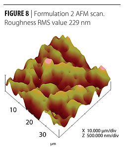 The five formulations were examined by atomic force microscopy (AFM) to study the surface morphology of each material. As you can see from the scans, Formulations 1 and 3 show smooth surfaces, which is to be expected from glossy films. Formulation 1 is delivered from solvent, which allows the two components to intermingle before being applied to the surface. This improves coalescence and results in a glossy film as seen in Figure 6.