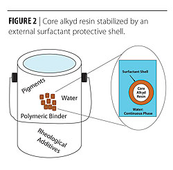 New-generation alkyd latexes, including the Beckosol® AQ line of alkyd latexes currently available from -Reichhold, are made by the introduction of external surfactants and advanced processing techniques that offer a stable latex in a continuous aqueous phase. These stable latexes are achieved by careful selection of the surfactant system and precise control of the emulsion process. A key factor for stabilization is attaining small emulsion particle diameters. The quality of the latex is dependent on the surface tension present in the particles. Alkyd latexes can be prepared by either direct emulsification or a phase inversion process. By achieving stable emulsions through the introduction of a protective surfactant shell, the core alkyd resin is stabilized and hydrolysis rates are hindered. This type of system addresses the VOC issue and provides the benefits of a traditional alkyd resin. See Figure 2 for a pictorial description of an alkyd binder in a latex paint stabilized by an outer protective layer.