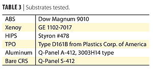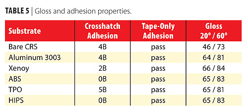 Table 5 demonstrates the gloss and adhesion properties. Gloss was excellent over all substrates, with some reduction in 20º gloss over bare CRS. Tape-only adhesion was excellent for all substrates, but quite variable with a crosshatch, depending on substrate. Generally, best adhesion was observed over metal and TPO substrate. Some improvement in crosshatch adhesion was noticed after 3 weeks dry.