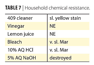 One-hour uncovered spot tests of several common household chemicals were conducted on an aluminum substrate. The film was washed with water and given 1 h and 24 h recovery before being rated (Table 7). No affect or significant difference was observed between CHEMPOL MPS 2410 and a conventional solventborne paint.