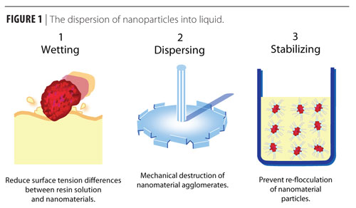 Nanoparticles are just like any other solid inorganic or organic particle that we try to incorporate into a resin matrix. If we just mix the particle into the solution, it will sink to the bottom because the solid particle has no compatible surface with the solution. It is similar to trying to float rocks on the surface of a lake. The rock is much denser than the water, and the water doesn’t have the required matrix to hold the rock at the surface.