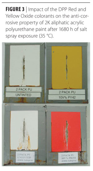 The addition of colorants can affect the anti-corrosive property of some coating systems, due to chemical incompatibility between the colorant and the binder of the coating. The evaluation of film degradation after being exposed to 1680 h of salt spray at 35 °C can provide us with an indication of whether the paint resistance was affected. In order to evaluate this property, 10% by volume of colorant was added to the paint base, cured for 7 days and exposed in the QCT for 1680 h. Results have showed that Chroma-Chem® 897 colorants have no impact on the coating’s anti-corrosive property (Figure 3).