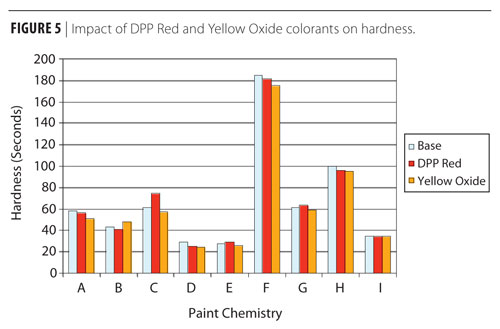The colorants were evaluated in nine commercially available industrial waterborne paint base chemistries; 2K aliphatic acrylic polyurethane, modified acrylic terpolymer, 2K epoxy-acrylic, 2K epoxy-amine adduct, acrylic enamel, 2K acrylic urethane, 1K acrylic-modified alkyd, and PUR alkyd. To see the impact of these colorants on paint properties, examples are shown below with the addition of either Yellow Oxide (an inorganic colorant) or DDP Red (an organic colorant) to a 2K aliphatic acrylic polyurethane.