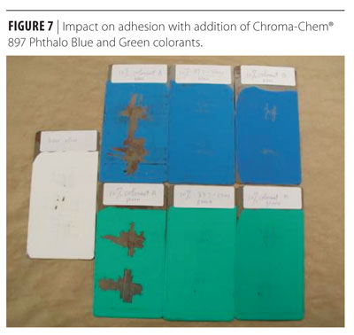 Colorant addition may have a negative influence on the water resistance of some coating systems due to chemical incompatibility between the colorant and the coating binder. The evaluation of adhesion and film integrity of the paint after being exposed to 100% humidity at 40 °C in a QCT condensation tester can provide us with an indication of whether the paint resistance was affected. In order to evaluate the impact of the next-generation colorants on the film integrity under high humidity conditions, 10% by volume of colorant was added the paint base, cured for 7 days and exposed in the QCT for 1680 h. As shown in Figure 2, the coatings tinted with Chroma-Chem® 897 showed no blisters or loss of adhesion, indicating that the colorants will have minimal impact on the coating’s water resistance.