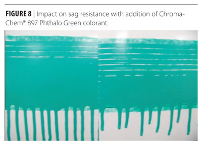 When a coating is applied on a non-horizontal substrate, it may sag due to gravity. Sag resistance is interrelated to the composition, viscosity and thickness of the coating. It is desirable that the paint base preserve its anti-sag property after the addition of colorants. Sag resistance was evaluated according to ASTM D 4400. Results, as shown in Figure 8 for Phthalo Green Colorant, confirm that the addition of 10% by volume of the colorant improved the sag resistance of the paint when compared with competitor colorant.
