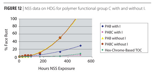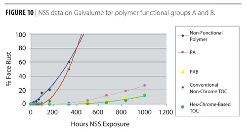 As shown in Figure 11, benefits in corrosion protection on hot-dip galvanized steel are provided when functional groups A and B are imparted to the polymer relative to the control polymer made without functional groups. Also shown is that the performance of both polymer A and polymer AB-based hybrid coatings formulations significantly exceeds that provided by a conventional commercial non-chrome-based TOC. The hybrid coating based on polymer AB provides a level of corrosion protection to hot-dip galvanized steel that very closely approaches that provided by hexavalent chrome-based TOC.