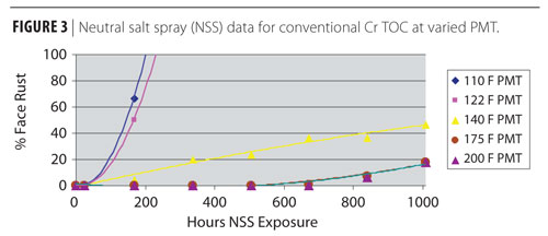 Figure 2 shows the relative drying rates of the novel, hybrid coating to a conventional, organic passivate as measured by thermal gravimetric analysis (TGA). Faster drying translates to a broader application window for the end user. Figures 3 and 4 show that in addition to faster drying, the corrosion resistance, as a function of drying condition during application (peak metal temperature), is provided over a much broader range.