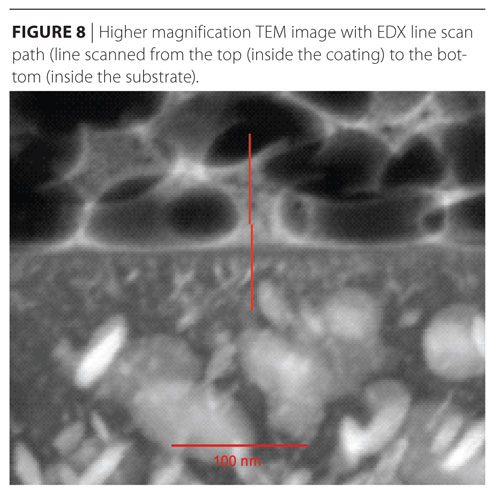 Attempts to mechanically cross-section the coating by imbedding in Bakelite and cutting/polishing down resulted in samples unsuitable for characterization because the sample preparation obscured the features of the very thin coating. Imaging of a cross-section using TEM obtained by Focused Ion Beam confirmed the 1 µm coating thickness and showed a unique morphology (Figure 1). Organic “bricks,” the dark ovals in the TEM images, function as a dispersed phase surrounded by a continuous inorganic “mortar” phase. There is no change to this morphology at either the air/coating or the coating/substrate interface; it is also remarkably consistent throughout the coating. The organic domains are ~100 nm across, which correlates well with the measured particle size of the resin component used.