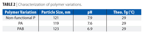 In this study, polymers with varying functional monomer content were prepared from a common base formulation, within the same polymerization scheme, at the same theoretical Tg and differing only in functional monomers used (Table 2). Each of the functional polymer variations were incorporated into a common hybrid coating formulation based on inorganic precursor X and inhibitor I.