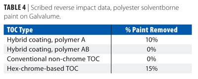 Also shown is that the performance of both polymer A and polymer AB-based formulations significantly exceeds that provided by a conventional commercial non-chrome based TOC. The hybrid coating based on polymer AB provides a level of corrosion protection to Galvalume-coated steel that is equivalent to that provided by hexavalent chrome-based TOC.