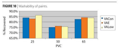Because the 65 PVC is past critical PVC (CPVC), a change in the relative performance by category for scrub resistance is expected. This was found to be true. In these formulations, the VAE and coalescent-free vinyl acrylics performed similarly and there was less of a performance gap with conventional vinyl acrylics (Figure 8). It is apparent that PVC and formulation become dominant factors in scrub resistance above CPVC, whereas below CPVC inherent binder properties play an important role.