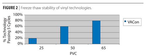 Freeze/thaw stability showed a better correlation across the binder categories. Figure 2 shows that conventional vinyl acrylics have a better chance of achieving freeze thaw stability across the PVC range. In evaluating the individual products within the polymer type across the paint formulas, tests show that all of the low-Tg technologies failed freeze/thaw for all paint systems. The conventional technologies showed a progression of more difficult freeze/thaw as the PVC of the paint system became lower. At very low VOC levels, the chance of having a paint that is freeze/thaw stable is directly related to the PVC of the paint and the Tg of the polymer. To achieve good freeze/thaw at low VOC, a substantial improvement in technology development is required.