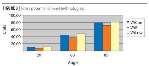 Gloss Development Gloss development of the respective paints was very similar in the 65 and 50 PVC paints, with the 20º/60º/85º gloss averaging 1.4/2.2/1.8 for the 65 PVC paints, and 1.4/2.5/2.0 for the 50 PVC paints. The gloss differential becomes the most apparent in the 25 PVC semigloss, where pigment interaction with the latex polymer influences gloss development (Figure 3). By category, the polymers having the best gloss development in each category are: